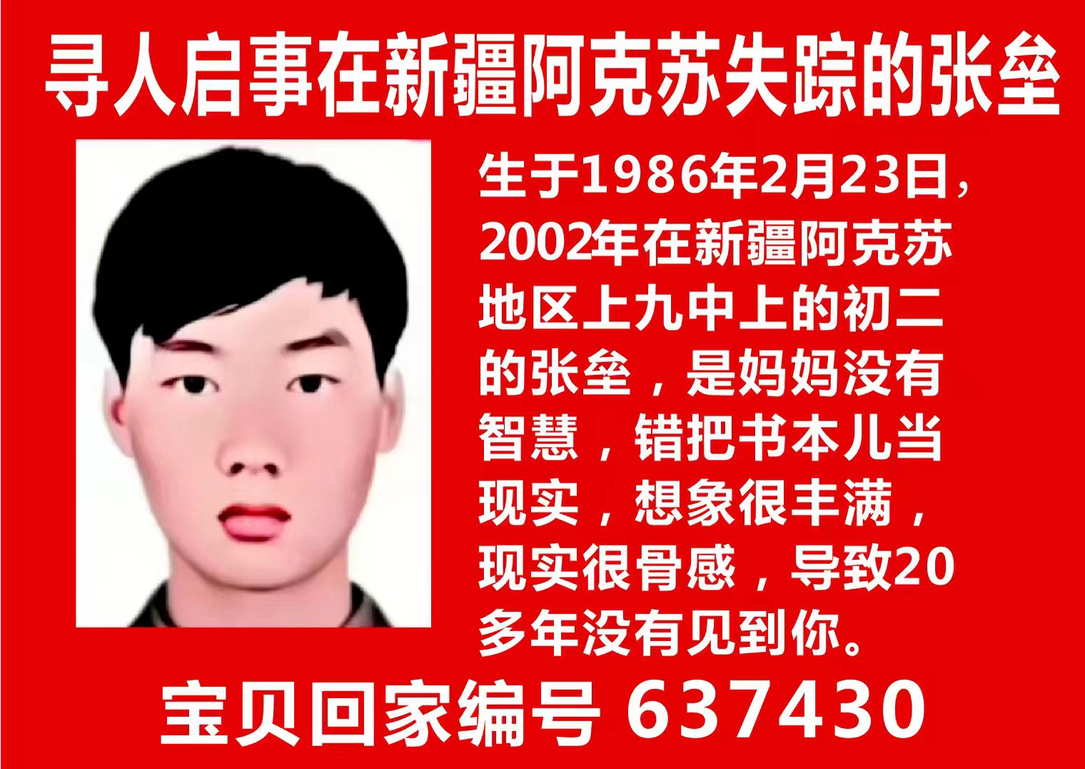 寻人启事 在新疆阿克苏失踪的张垒